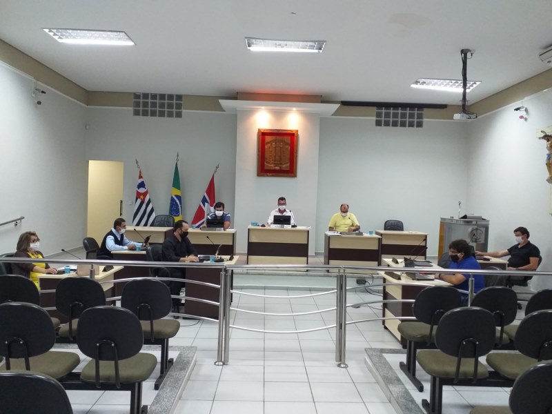 Vereadores presentes: ANGELA MARIA BUSNARDO, DOUGLAS FRANÇA AIRES SCARDELATO, FABIO COLA DE LIMA, JUAREZ EDUARDO RIBEIRO, LUIZ CARLOS DE MORAES JÚNIOR, ROQUE DONIZETI CÂMARA, RORIVALDO OTÁVIO DAS CHAGAS, e o Presidente SIDNEY ZÓSIMO VIDOTTI.