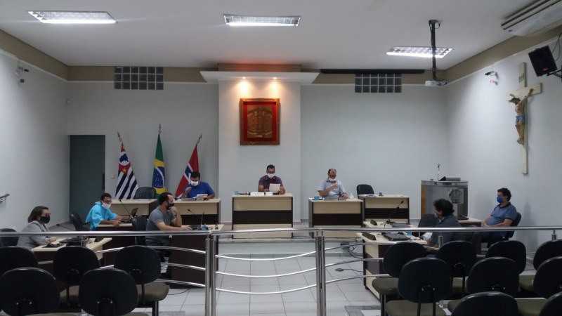 Vereadores presentes: ANGELA MARIA BUSNARDO, DOUGLAS FRANÇA AIRES SCARDELATO, FABIO COLA DE LIMA, JUAREZ EDUARDO RIBEIRO, LUIZ CARLOS DE MORAES JÚNIOR, ROQUE DONIZETI CÂMARA, RORIVALDO OTÁVIO DAS CHAGAS, e o Presidente SIDNEY ZÓSIMO VIDOTTI.