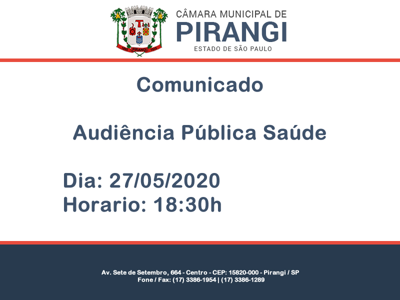 E, por fim, fica determinado que, em parceria com a Câmara Municipal de Pirangi, a audiência será transmitida pelo link: http://camarapirangi.sp.gov.br/paginas/tv-camara, no dia 27 de maio de 2020, às 18:30 horas.
