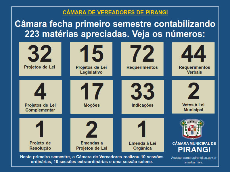 Neste primeiro semestre, a Câmara de Vereadores de Pirangi realizou 10 sessões ordinárias, 10 sessões extraordinárias e uma sessão solene.