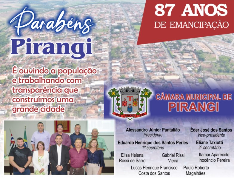 O município de Pirangi completa 87 anos de emancipação político-administrativa neste dia 7 de março. A Câmara Municipal parabeniza a cidade pelo seu aniversário por meio de mensagem assinada pela Mesa Diretora e demais vereadores.
