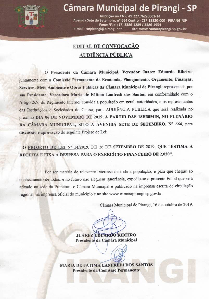 O Presidente da Câmara Municipal, Vereador Juarez Eduardo Ribeiro, juntamente com a Comissão Permanente de Economia, Planejamento, Orçamento, Finanças, Serviços, Meio Ambiente e Obras Públicas da Câmara Municipal de Pirangi, representada por sua Presidente, Vereadora Maria de Fátima Lanfredi dos Santos, em conformidade com o Artigo 269, do Regimento interno, convida a população em geral, autoridades, e os representantes das Instituições e Sociedades de Classe, para AUDIÊNCIA PÚBLICA que será realizada no próximo DIA 06 DE NOVEMBRO DE 2019, A PARTIR DAS 18H30MIN, NO PLENÁRIO DA MÂMARA MUNICIPAL, SIO A AVENIDA SETE DE SETEMBRO, Nº 644, para discussão e aprovação do seguinte Projeto de Lei.