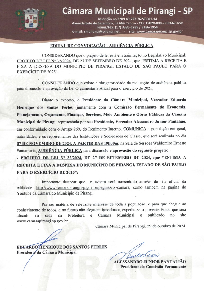 - Projeto de Lei nº 32/2024, de 27 de setembro de 2024, que "Estima a receita e fixa a despesa do Município de Pirangi, Estado de São Paulo para o Exercício de 2025".