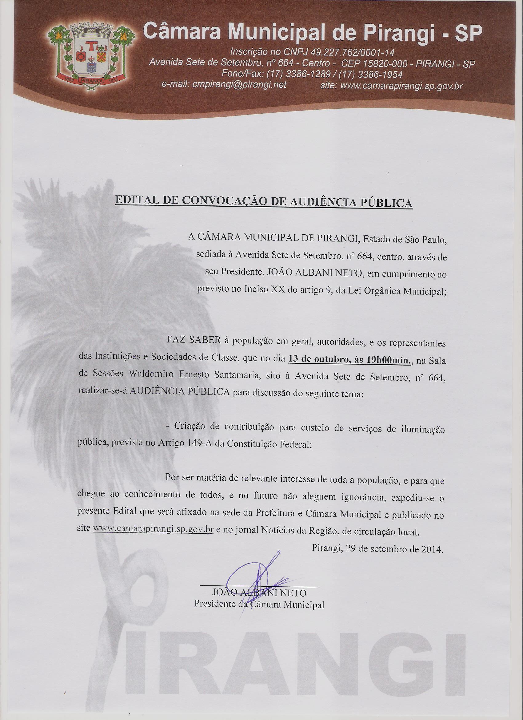 No dia 13 de outubro, às 19h00min., na Sala de Sessões Waldomiro Ernesto Santamaria, sito à Avenida Sete de Setembro, nº 664, realizar-se-á AUDIÊNCIA PÚBLICA para discussão da Criação de contribuição para custeio de serviços de iluminação pública.