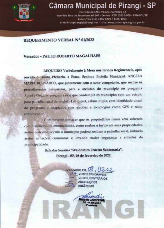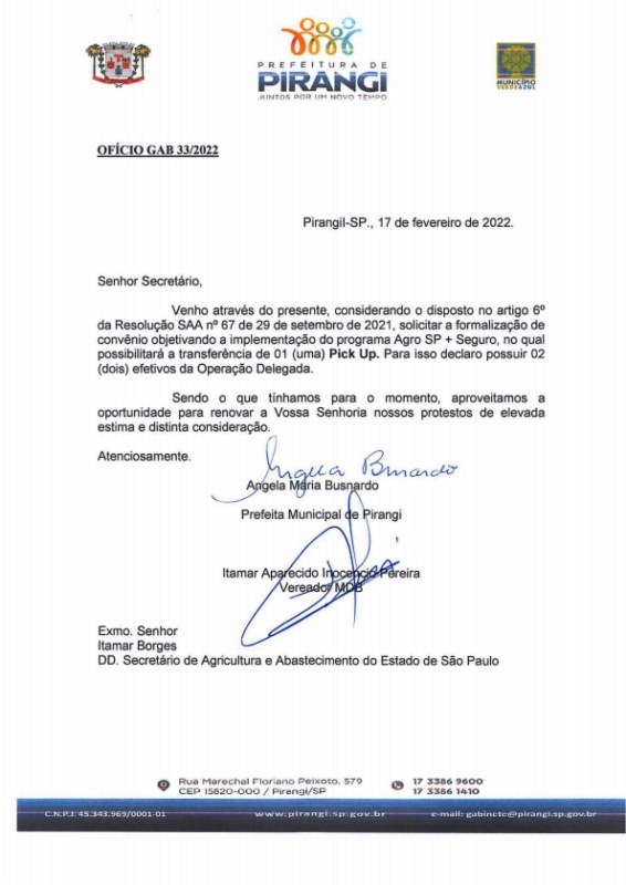 Pirangi foi contemplado com o programa “Agro SP+Seguro” e recebeu uma viatura totalmente equipada para o trabalho na zona rural. O veículo foi viabilizado após solicitação do vereador Itamar Pereira, em conjunto com a prefeita Bila Busnardo, ao secretário estadual da Agricultura, Itamar Borges. O vereador falou sobre a importância do veículo que chega para reforçar a frota municipal. “Este veículo vai contribuir para melhorar a segurança na zona rural, uma conquista importante para o município e para quem mora e produz no campo”, ressaltou. O pleito ainda contou com o apoio do vereador Paulo Magalhães. Ele apresentou durante sessão ordinária da Câmara Municipal um requerimento que solicita exatamente a inclusão do município no programa para beneficiar a população rural.