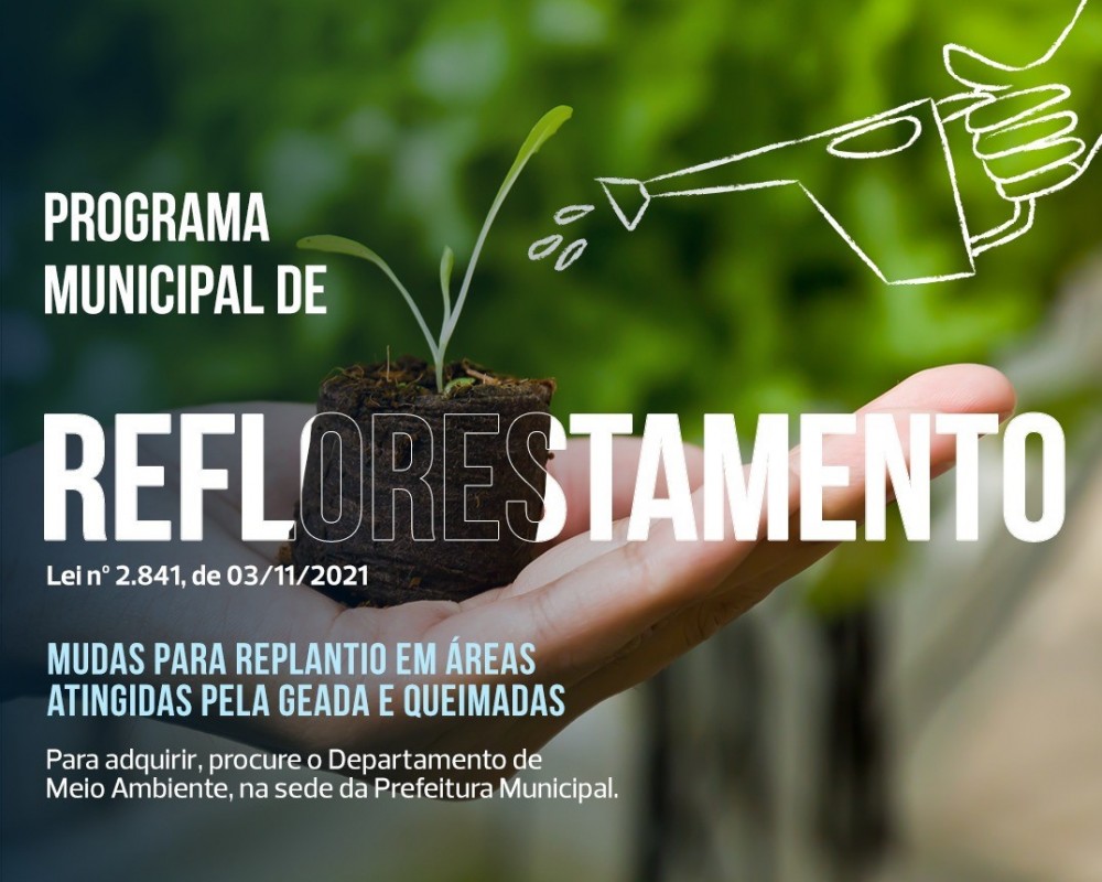 Com base na Lei nº 2.841, de 03/11/2021, autoria dos vereadores Pantalião, Eduardo, Gabriel, Itamar e Lucas o Programa Municipal de Reflorestamento é uma parceria entre a Prefeitura junto da Câmara Municipal e Diretoria de Agricultura, Abastecimento e Meio Ambiente, a fim de promover o reflorestamento de áreas rurais atingidas pelas geadas e queimadas no ano de 2021.