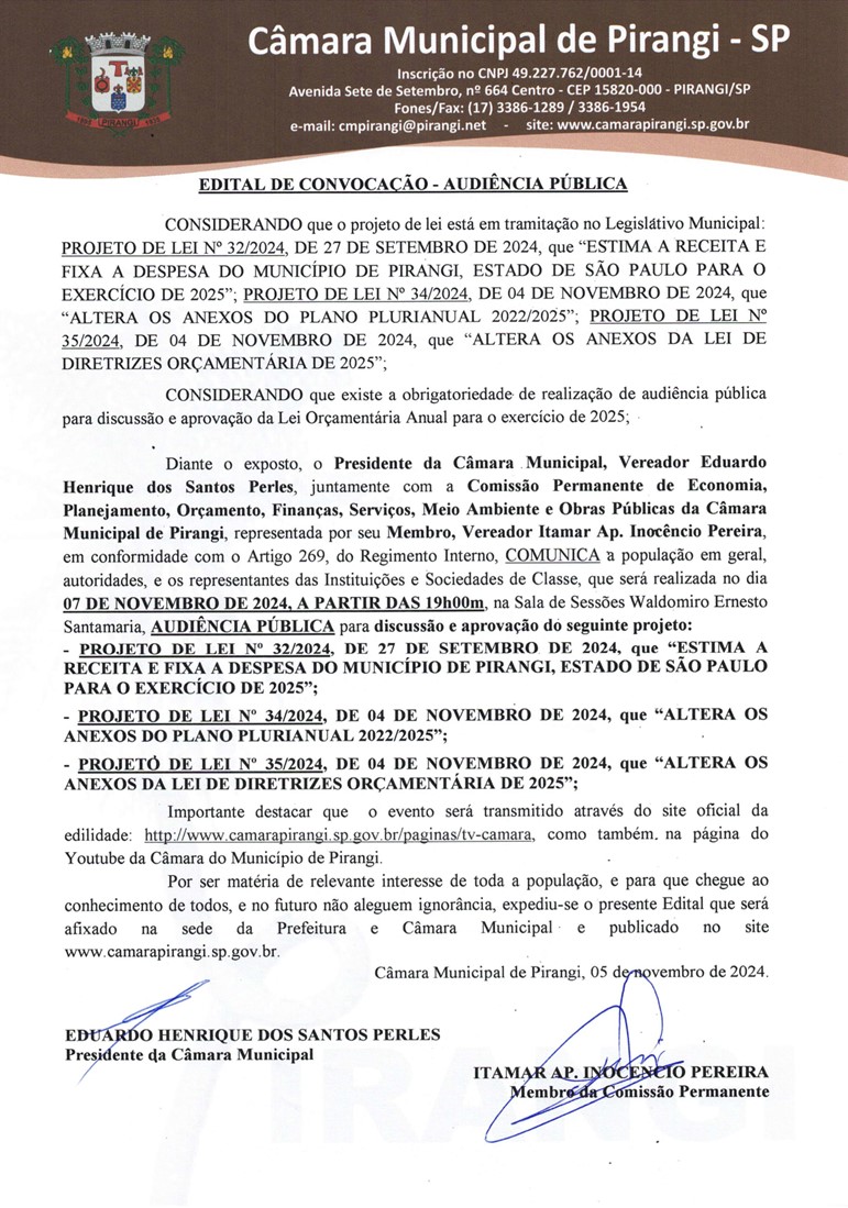 - Projeto de Lei nº 32/2024, de 27 de setembro de 2024, que "Estima a receita e fixa a despesa do Município de Pirangi, Estado de São Paulo para o Exercício de 2025";
